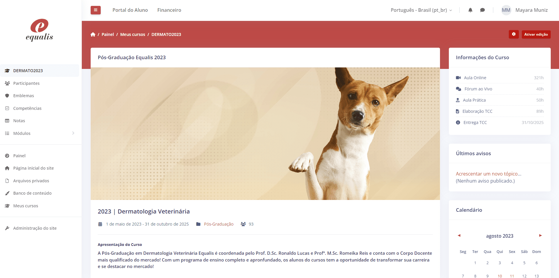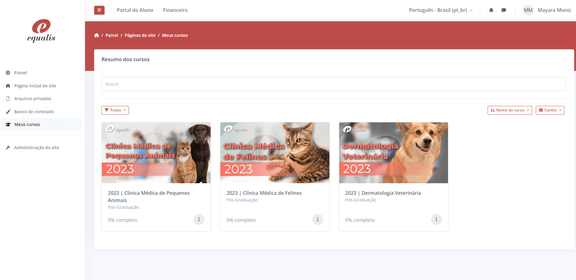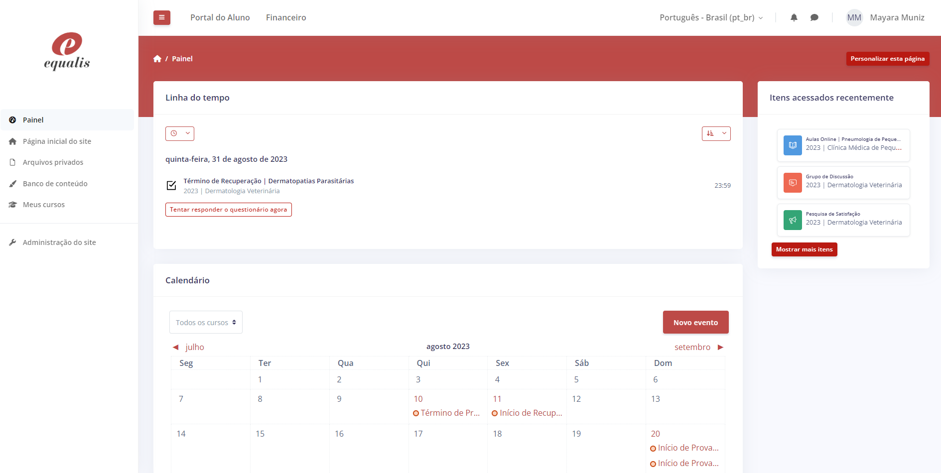 Essa é sua nova tela inicial. Aqui você acompanha o calendário acadêmico, e ao lado esquerdo terá acesso aos cursos matriculados, clicando em “Meus cursos”.