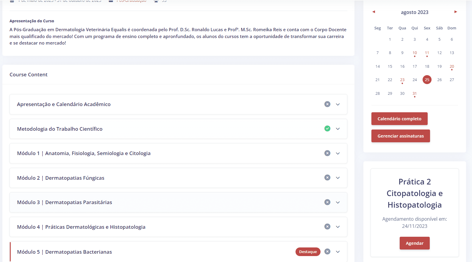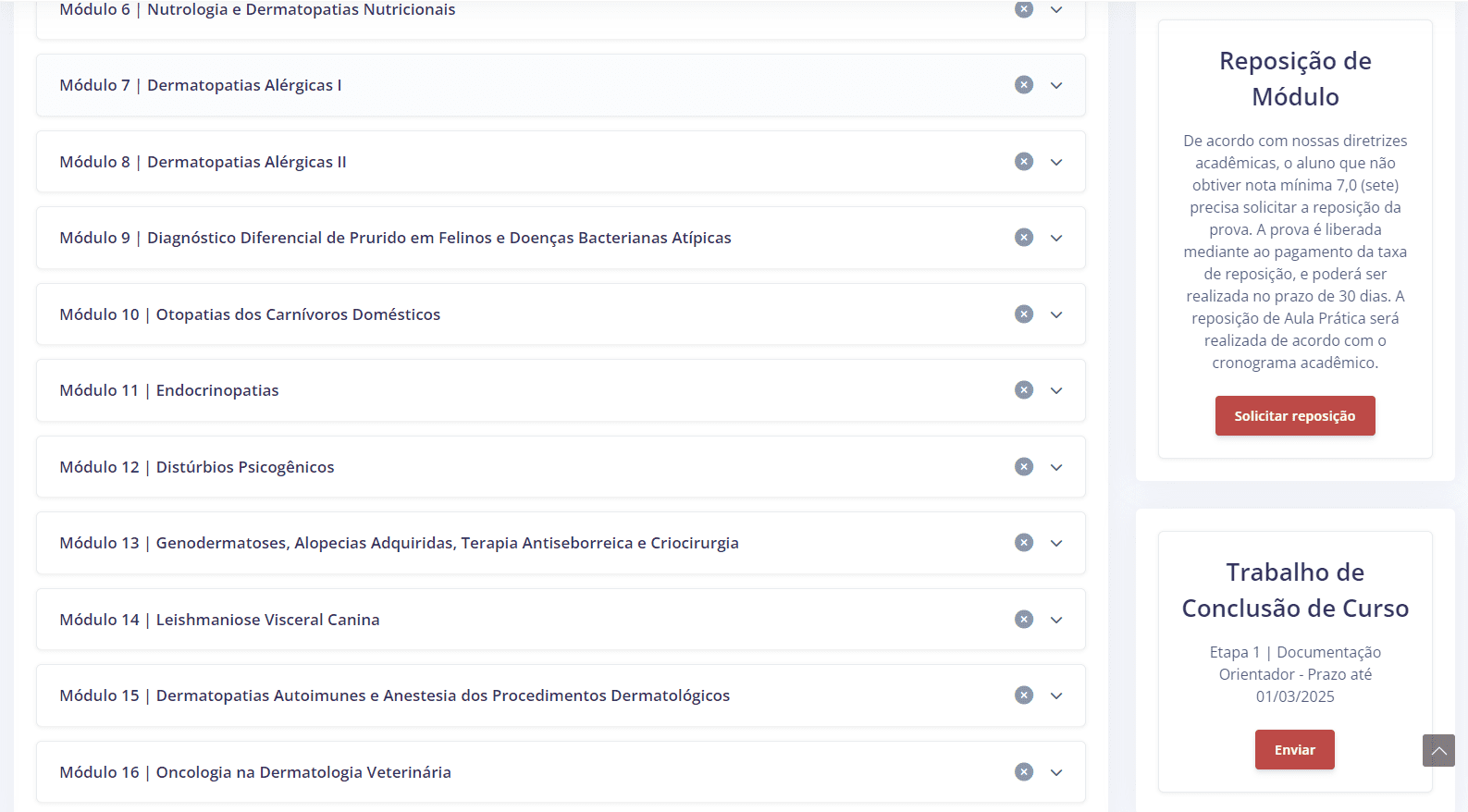 Aqui você encontra todas as aulas e material didático separados por módulos, em formato de lista. E na lateral direita você tera acesso rápido aos principais serviços da secretaria, como: